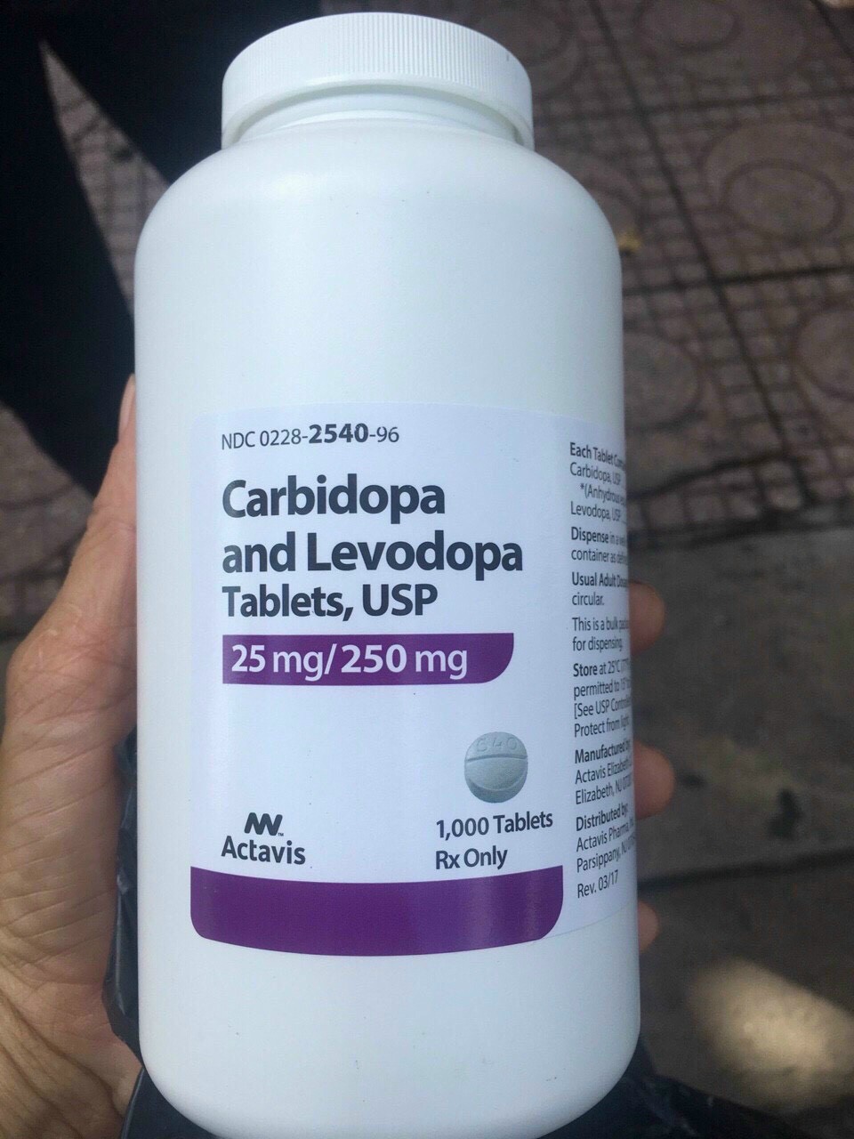 Viên nén Carbidopa và Levodopa USP, 25 mg / 250 mg chứa 25 mg carbidopa và 250 mg levodopa.
